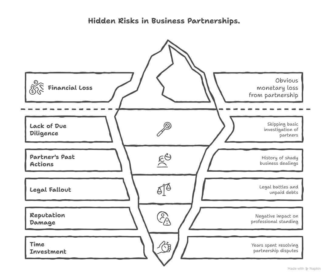 Six months into their partnership, angry emails started flooding in. Turns out David had a history of starting companies, taking investor money, and disappearing when things got complicated. There were lawsuits, unpaid contractors, and a trail of burned business relationships that would have taken me 20 minutes to discover online.